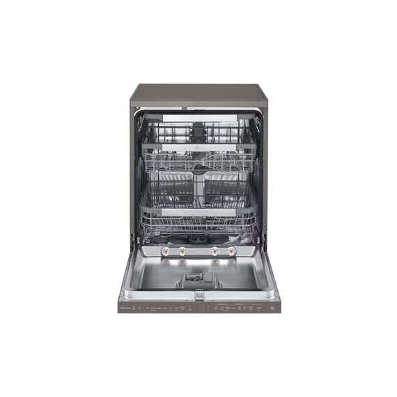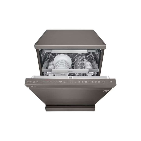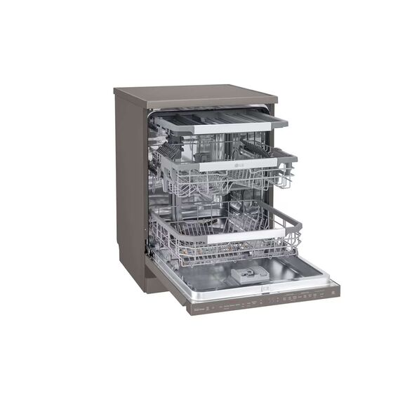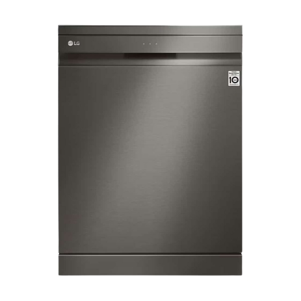 غسالة صحون بالبخار LG QuadWash™ Steam Dishwasher, 14 Place Settings, EasyRack™ Plus, Inverter Direct Drive, ThinQ, Black Stainless color هي غسالة مدمجة فاخرة بسعة 14 مكانًا، مثالية للعائلات والمناسبات. تتميز بنظام QuadWash™ المبتكر الذي يستخدم أربعة أذرع رش متعددة الحركات مع نفاثات ضغط عالي لضمان تنظيف شامل من جميع الزوايا. توفر تقنية TrueSteam™ بخارًا بدرجة حرارة تصل إلى 80°م أثناء دورة الشطف لتقديم عناية صحية فعالة وإزالة البقع مع تقليل بقع الماء على الأواني والكؤوس. تعمل ميزة Auto Open Dry على تحسين أداء التجفيف من خلال فتح الباب تلقائيًا في نهاية الدورة لإخراج البخار. مزودة بمحرك Inverter Direct Drive قوي وهادئ بمستوى ضوضاء يقارب 41–44 ديسيبل مع ضمان لمدة 10 سنوات، مما يضمن الكفاءة والمتانة طويلة الأمد مع تشغيل منخفض الضوضاء. كما يمنحك نظام EasyRack™ Plus مرونة عالية بفضل الرف العلوي القابل للتعديل، والأسنان القابلة للطي، ورف ثالث لتسهيل ترتيب الأطباق والأواني المختلفة الأحجام. تشمل الميزات الذكية الاتصال عبر ThinQ™ Wi-Fi للتحكم عن بُعد، ميزة Smart Diagnosis™، دورة Turbo، غسيل المنطقة المزدوجة، وتنبيه تنظيف الجهاز بعد كل 30 دورة. تأتي الغسالة بتصميم أنيق من الفولاذ الأسود المقاوم للصدأ بأبعاد 600×850×600 ملم ووزن يقارب 52 كجم، كما تحمل تصنيف طاقة A+++ وتستهلك حوالي 9–10 لترات من الماء لكل دورة.