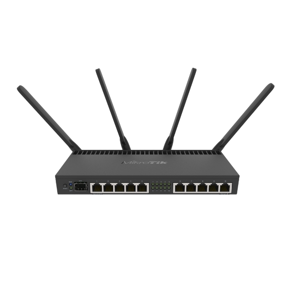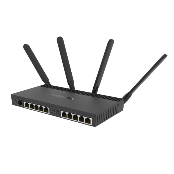 The MikroTik RB4011iGS+5HacQ2HnD-IN is a high-performance, all-in-one wireless router designed for demanding home and small business networks. It combines a powerful quad-core CPU with a versatile port configuration: ten Gigabit Ethernet ports (one with PoE-out) and a dedicated SFP+ cage for a 10G fiber uplink. Integrated into the unit is a dual-band wireless access point supporting Wi-Fi 5 (802.11ac) with a 2x2 MIMO antenna array, providing strong wireless coverage. Housed in a compact, indoor metal case with passive cooling for silent operation, it runs the full-featured RouterOS, offering advanced routing, firewall, QoS, and VPN capabilities. This makes it an exceptionally capable and scalable solution for users needing a single device that can act as a router, switch, and access point.