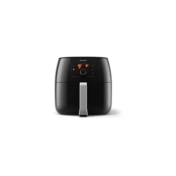 The Philips Premium Airfryer XXL HD9650/91 is a large-capacity air fryer designed for healthier cooking, capable of frying with up to 90% less fat thanks to its Fat Removal Technology. It offers a 1.4-kg basket (approx. 7.3-litre capacity) suitable for whole chickens or large family meals, and includes a Keep-Warm mode that maintains food temperature for up to 30 minutes. Equipped with RapidAir technology, it uses faster airflow to deliver food that’s crispy on the outside and tender inside. The cooker has 5 preset cooking programs, a digital interface with QuickControl dial to set temperature between 40-200 °C and timer up to 60 minutes. Cleaning is easier thanks to a QuickClean non-stick basket and all removable parts being dishwasher-safe. It also features a cool-wall exterior, automatic shut-off, and a sleek black finish with a digital display.
