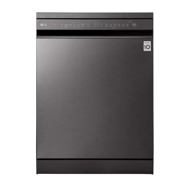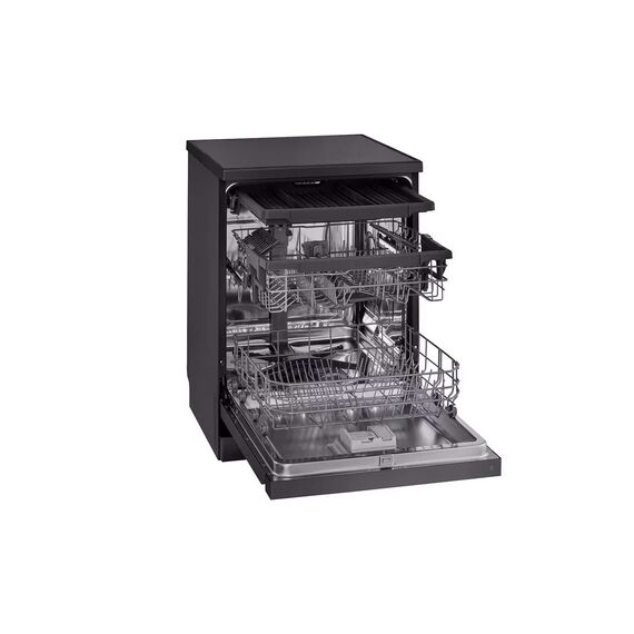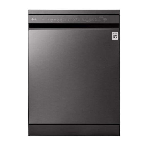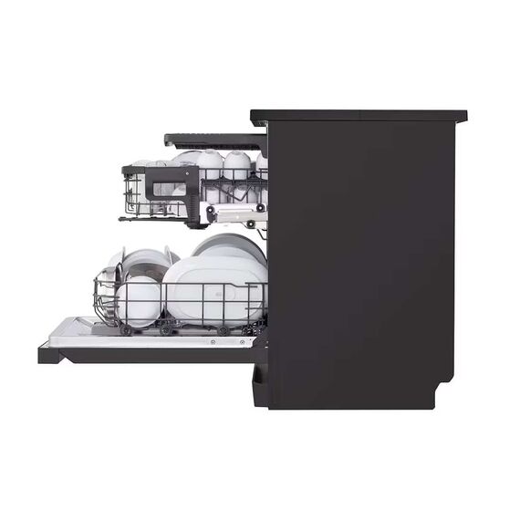 The LG QuadWash™ Dishwasher, 14 Place Settings, EasyRack™ Plus, Inverter Direct Drive, ThinQ, Black color dishwasher combines elegant design with cutting-edge technology to deliver powerful and efficient cleaning. Equipped with QuadWash™ technology, it uses four multi-motion spray arms to ensure complete coverage and spotless results from every angle. Its TrueSteam® function adds high-temperature steam to eliminate bacteria and reduce water spots on dishes. With a spacious interior that accommodates up to 14 place settings, the adjustable racks and EasyRack™ Plus system allow for flexible loading of large pots, pans, and delicate items. The Inverter Direct Drive Motor ensures quiet operation and long-lasting durability, while the SmartThinQ® app offers remote control and cycle monitoring for added convenience.