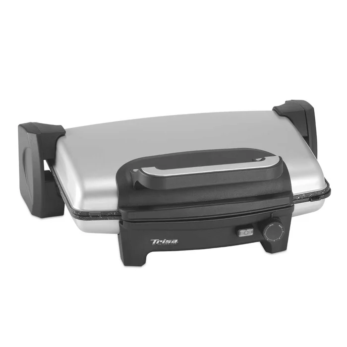 The Trisa “Hot Snack” is a double-plate tabletop barbecue / contact grill offering 1800 W of power for fast and efficient grilling. It features plates with a non-stick coating that are removable and dishwasher-safe. The lid is hinged to open up to 180°, expanding its usable surface so you can grill meats, vegetables, or paninis more evenly. The plate unit is black and silver, with dimensions about 43.5 × 37.3 × 17.6 cm. Ideal for everyday use or entertaining.