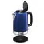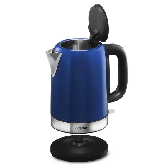 The Trisa “Diners Edition” Blue 1.7L electric kettle combines style and functionality. It features a high-quality stainless steel body with a sleek blue finish. The kettle offers a capacity of 1.7 liters and includes a removable and washable filter. Safety features include an automatic shut-off with Strix control and LED lighting. The lid opens with the push of a button, and the base allows for 360° rotation with cord storage. It is protected against overheating and dry running.