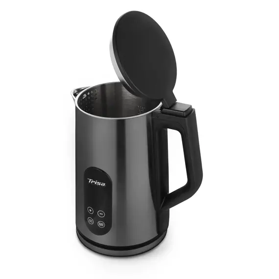 The Trisa Digital Boil SST (stainless steel) electric kettle is a premium 1.7-liter kettle made with double-walled stainless steel housing for both durability and better heat retention. It offers a digital display to control temperature precisely from 40-100 °C, a keep-warm function valid for up to 4 hours, and safety features including a Strix controller, overheating protection, and dry-run protection. It also has a one-touch lid mechanism and large EAN number 7640306329141 for reference.