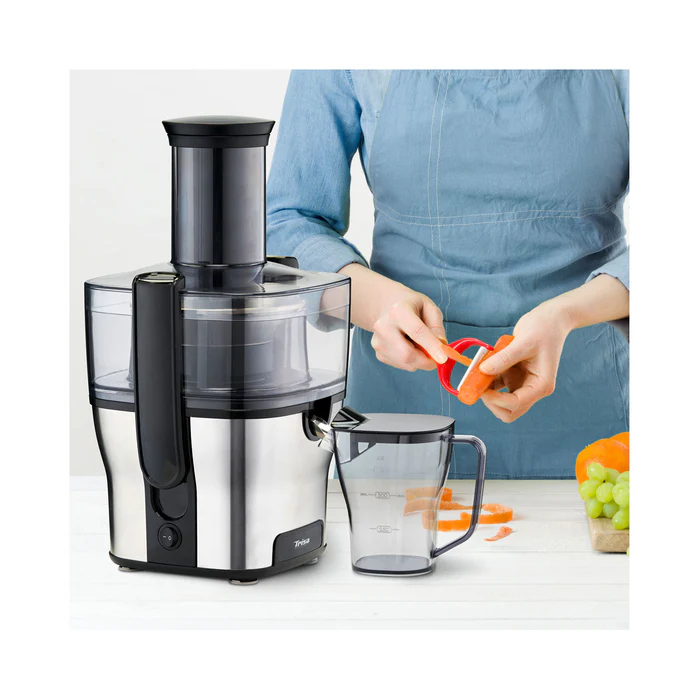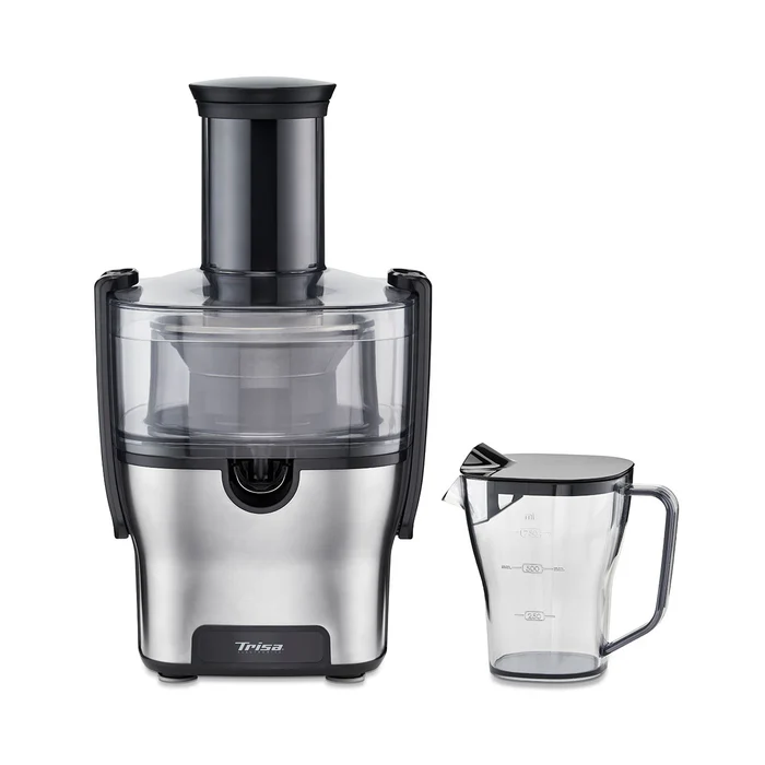 The Trisa “Pure Juice” is a high-performance centrifugal juicer engineered for fresh fruit and vegetable juicing. It features a 1500 W motor with a high rotation speed of 12,500 rpm for excellent juice yield. Large feed chute (ø 75 mm) accommodates whole fruits or large pieces. Juice is separated automatically from the pulp, which is collected in a 2 L container, while the juice is collected in a 750 ml jug. High-quality stainless steel blade and filter ensure durability and hygiene. Anti-slip feet provide stability during use. Item number: 7011.7545.
