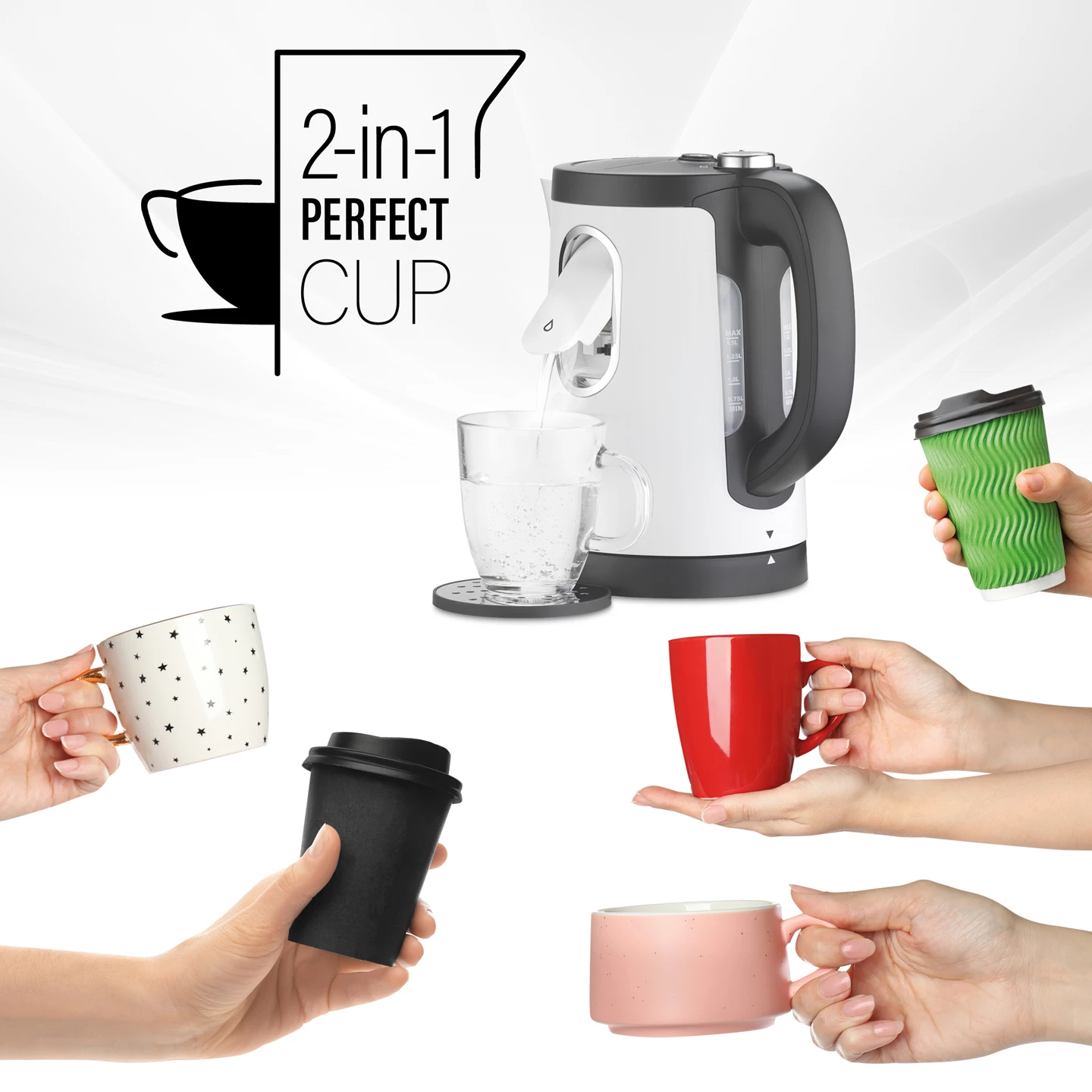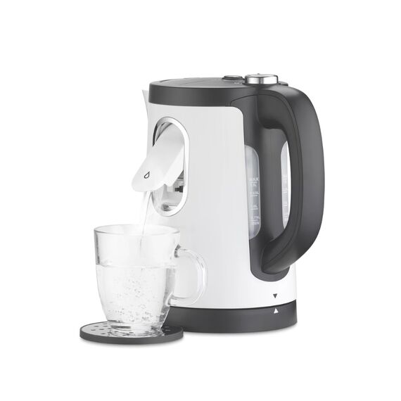 This Trisa electric kettle offers a clever 2-in-1 design combining both a regular kettle and a hot-water dispenser. It has a 1.50 L capacity, 2400 W power, and lets you select small cup sizes (125-250 ml) via a dispenser feature, or boil up to the full kettle capacity (0.75-1.5 L). It includes automatic shut-off (Strix controller) for safety, programmable quantity setting, and a stop function to interrupt dispensing. Ideal when you want just a cup or a full pot without waste.