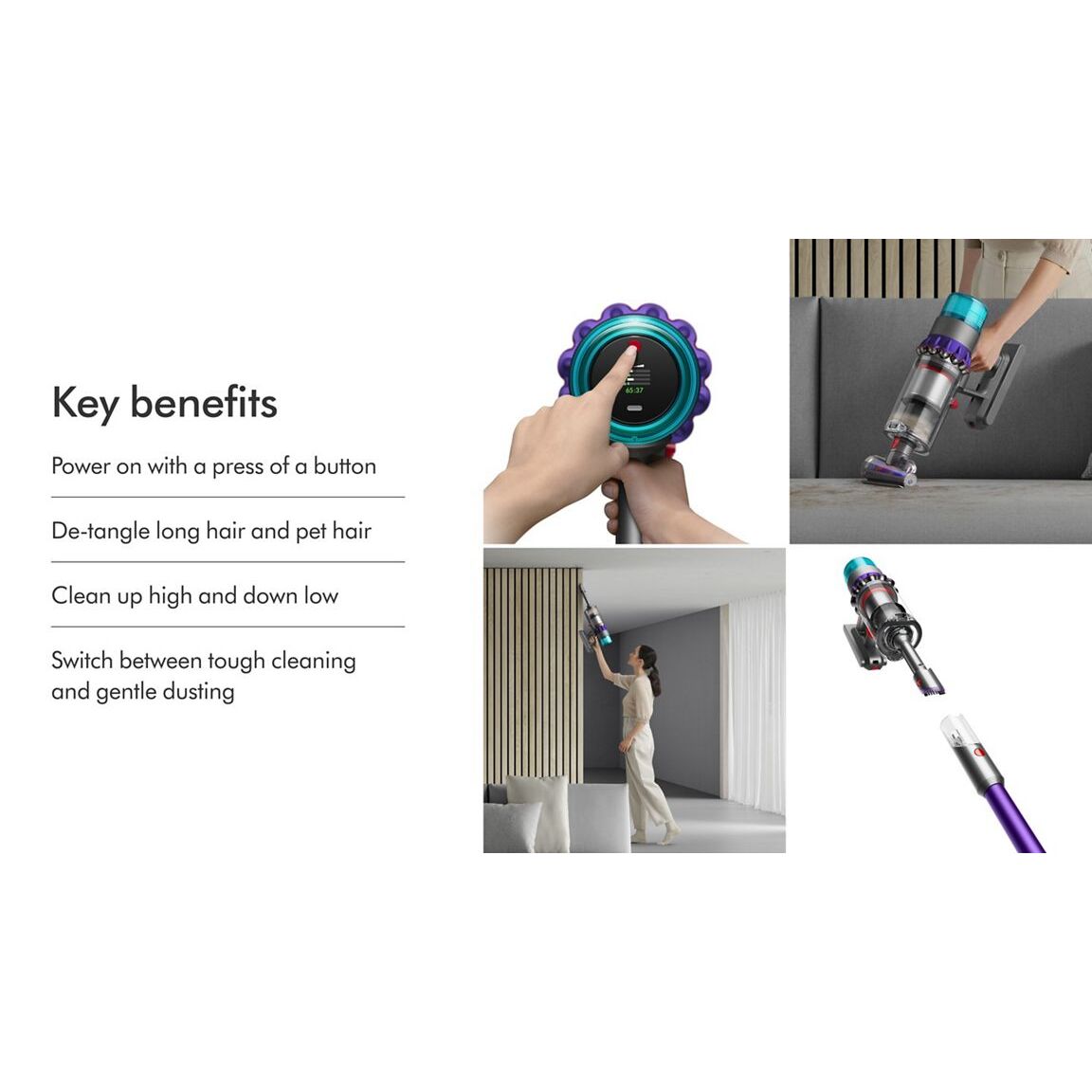 The Dyson Stick Vacuum Cleaner GEN 5 DETECT is a powerful cordless vacuum designed for thorough cleaning across all floor types. It features advanced laser technology that highlights hidden dust and particles, ensuring no debris is missed. The high torque cleaner head automatically adjusts suction to suit different surfaces for optimal performance. Its LCD screen provides real time information on battery life, cleaning mode, and particle count for precise control. Equipped with a strong digital motor, it delivers consistent suction and is complemented by a whole machine HEPA filtration system that captures 99.99% of microscopic particles. Lightweight and versatile, the Dyson Stick Vacuum Cleaner GEN 5 DETECT comes with multiple attachments for efficient cleaning in every corner of the home.