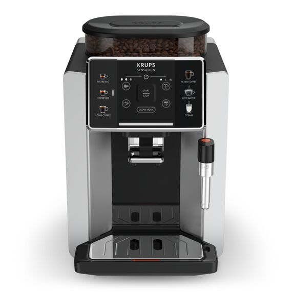 Krups SENSATION - EA910E40 A bean-to-cup automatic espresso machine from Krups designed to simplify fresh coffee at home. The Sensation EA910E40 features a metal conical burr grinder with 5 grind settings, a strong 15-bar pressure pump, and a 1.7-litre removable water tank. It has a 260 g bean hopper, a manual steam nozzle for milk frothing, and serves multiple drink types including ristretto, espresso, long coffee, filter coffee and hot water/americano, with the ability to brew in two cups simultaneously. It offers 3 temperature levels, 3 strength settings, adjustable cup sizes (50-220 ml), a favourite memory function, and automatic cleaning/rinsing and descaling programs. Stylish silver & black finish, with compact dimensions and easy maintenance.